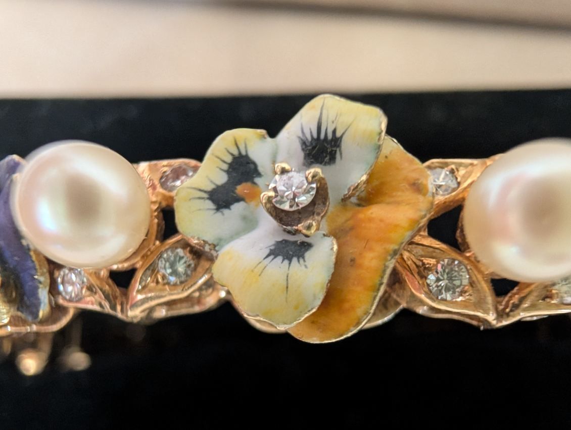 14KG Van Gogh enameled Bangle Bracelet - pansies, pearls, diamonds!